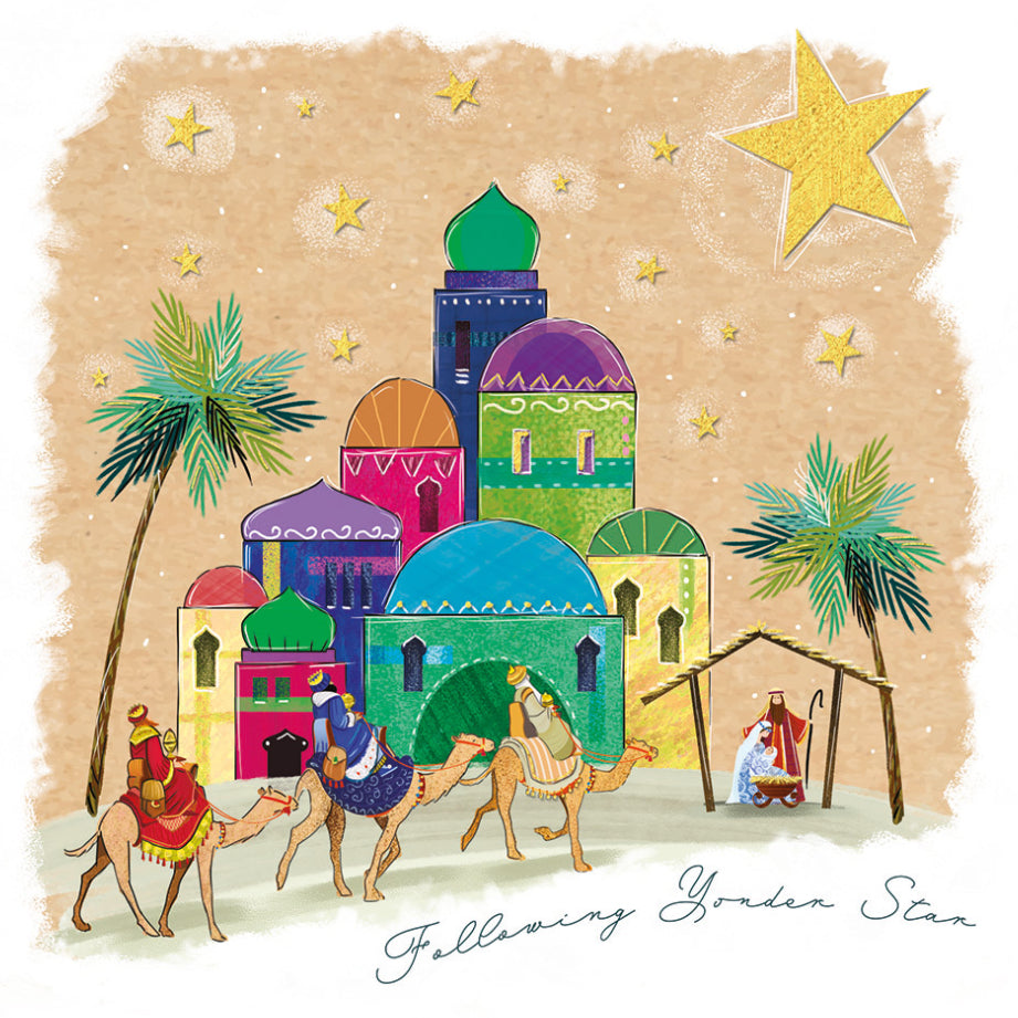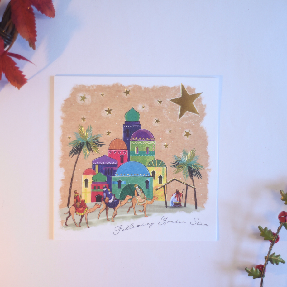 This Christmas card captures the timeless scene of the three wise men presenting their gifts, symbolising generosity and celebration. The card offers an elegant and meaningful way to send heartfelt holiday greetings. Its classic imagery and refined style make it ideal for sharing the festive spirit with loved ones and colleagues alike.