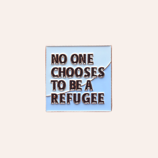 This 'No One Chooses To Be A Refugee' pin badge features durable nickel plating and a secure metal clutch, making it a stylish and lasting accessory.